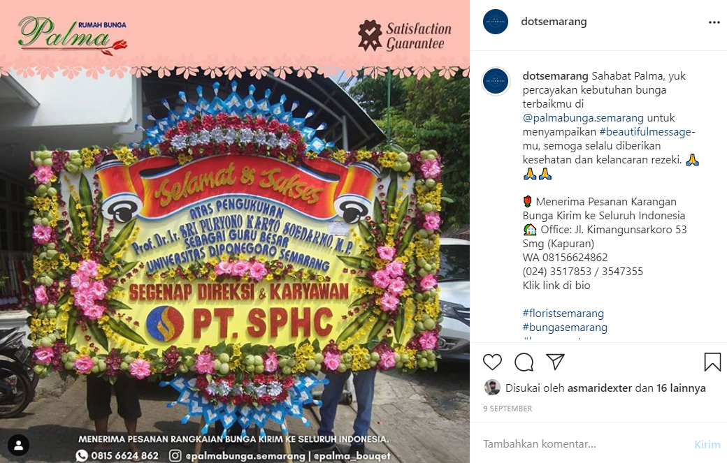 Bunga Di Semarang 175 likes · 33 talking about this. Tempat wisata di semarang yang satu ini bernama gardu pandang lereng kelir. Anda adalah perusahaan, distributor, toko, dan supplier bunga dan tanaman untuk wilayah di semarang ayo segera daftarkan perusahaan anda. Toko bunga semarang duta florist melayani pemesanan karangan bunga papan ucapan, pengiriman bunga papan free ongkir wilayah semarang sekitarnya.
