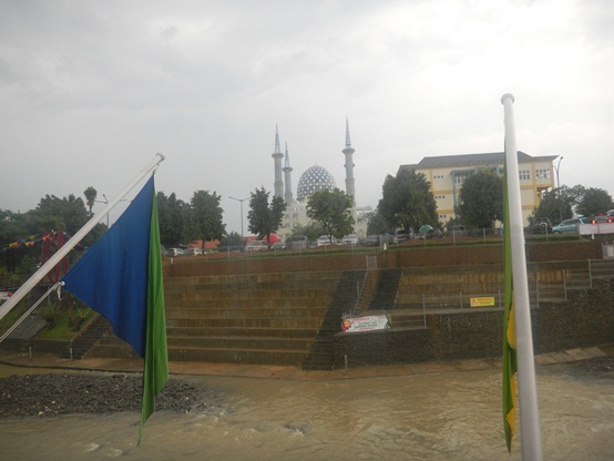 Pemandangan di sekitar pasar apung cukup indah, di seberang sungai terdapat berdiri kokoh masjid yang cantik.